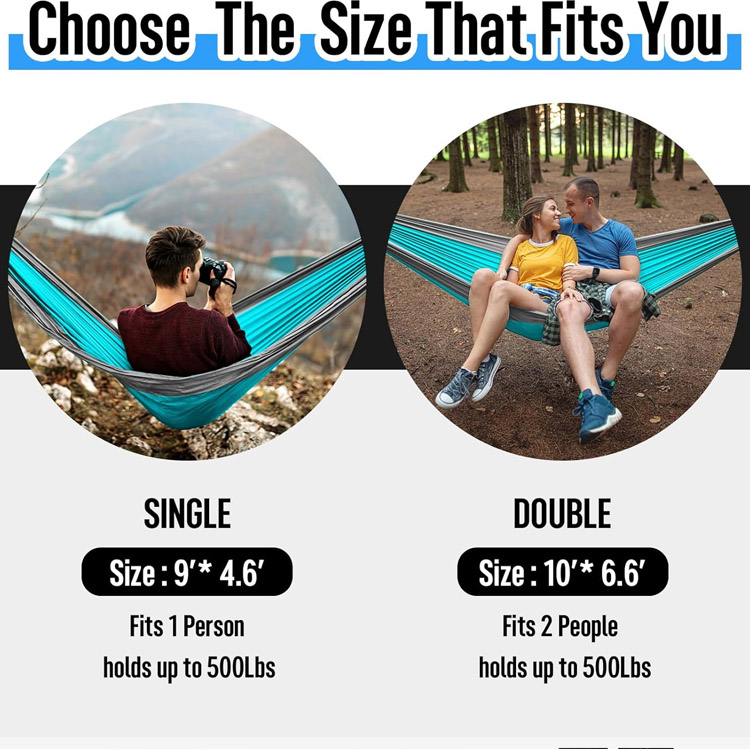 Dvojna in enojna prenosna viseča mreža za kampiranje. Vaš ultimativni vsestranski sistem za sprostitev za avanture na prostem. Ta viseča mreža za kampiranje je s svojo prilagodljivo zasnovo primerna za dvojne in enojne uporabnike. Ta lahka najlonska viseča mreža s padalom, opremljena s profesionalnimi trakovi za drevo, zagotavlja maksimalno udobje in prenosljivost.