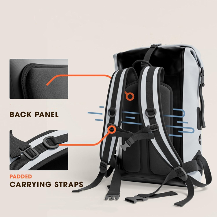 Vključuje udobno oblazinjeno naramnico, več ročajev za nošenje in zunanje kompresijske trakove za varno pritrditev na nahrbtnike ali plovilo med aktivnim gibanjem.