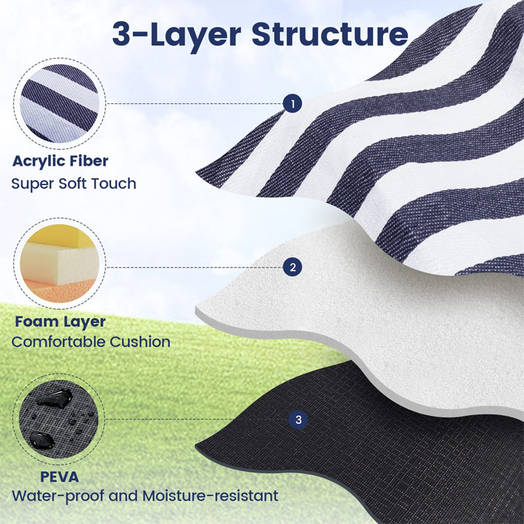 Zložljiva črtasta trpežna vodoodporna odeja za piknik podlogo. Vaš vrhunski spremljevalec na prostem za piknike in avanture. Ta podloga za piknik Factory-Direct ima kompaktno zložljivo zasnovo s priročnim ročajem za prenašanje. Izdelan iz črtastega trpežnega vodoodpornega blaga, ponuja možnosti tiskanja po meri za veleprodajne stranke.