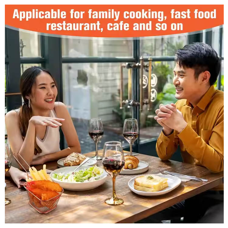 Ta košarica za ocvrte, zasnovana v kompaktni mini velikosti, je idealna za postrežbo posameznih delov pomfritov, čebulnih obročev ali prigrizkov. Dodaja gurmanski pridih predstavitev hrane v restavracijah, kavarnah, tovornjakih s hrano ali na domačih zabavah.