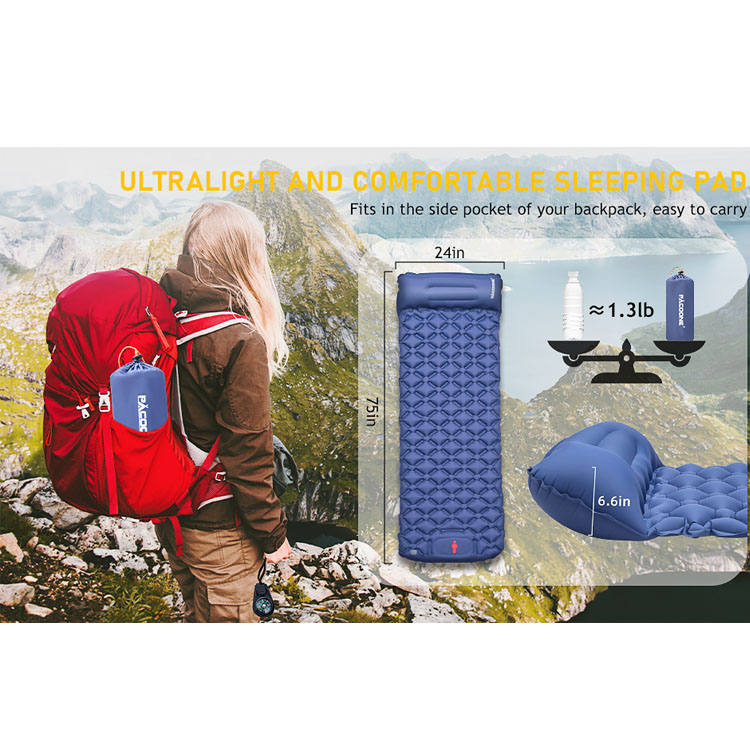 Lahek najlonski material, zložljiva spalna podloga za šotor za kampiranje. Vaša vrhunska prenosna rešitev za spanje za pustolovščine na prostem. Ta ultralahka napihljiva vzmetnica ima možnost napihovanja z enim samim pritiskom in integrirano zasnovo vzglavnika. Izdelan je iz vzdržljivega najlonskega materiala in zagotavlja vrhunsko udobje za pohodništvo in kampiranje ter zagotavlja mirne noči kjer koli.